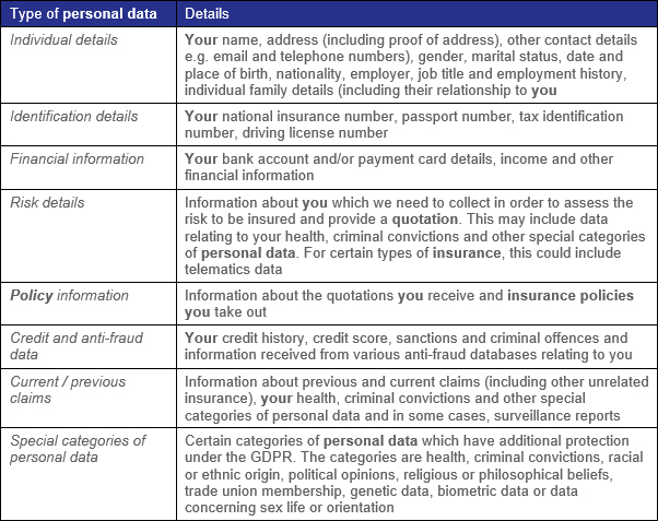 Personal data means any data from which you can be identified and which relates to you. It may include data about any claims you make. Personal data does not include any data where the identity of a natural person has been removed (anonymous data).